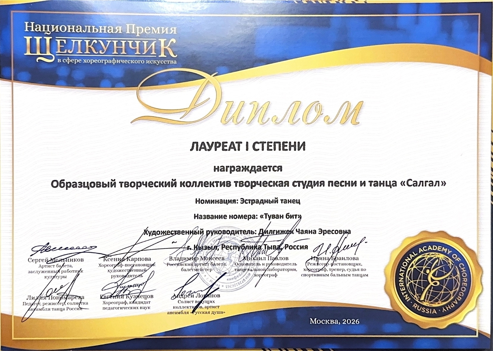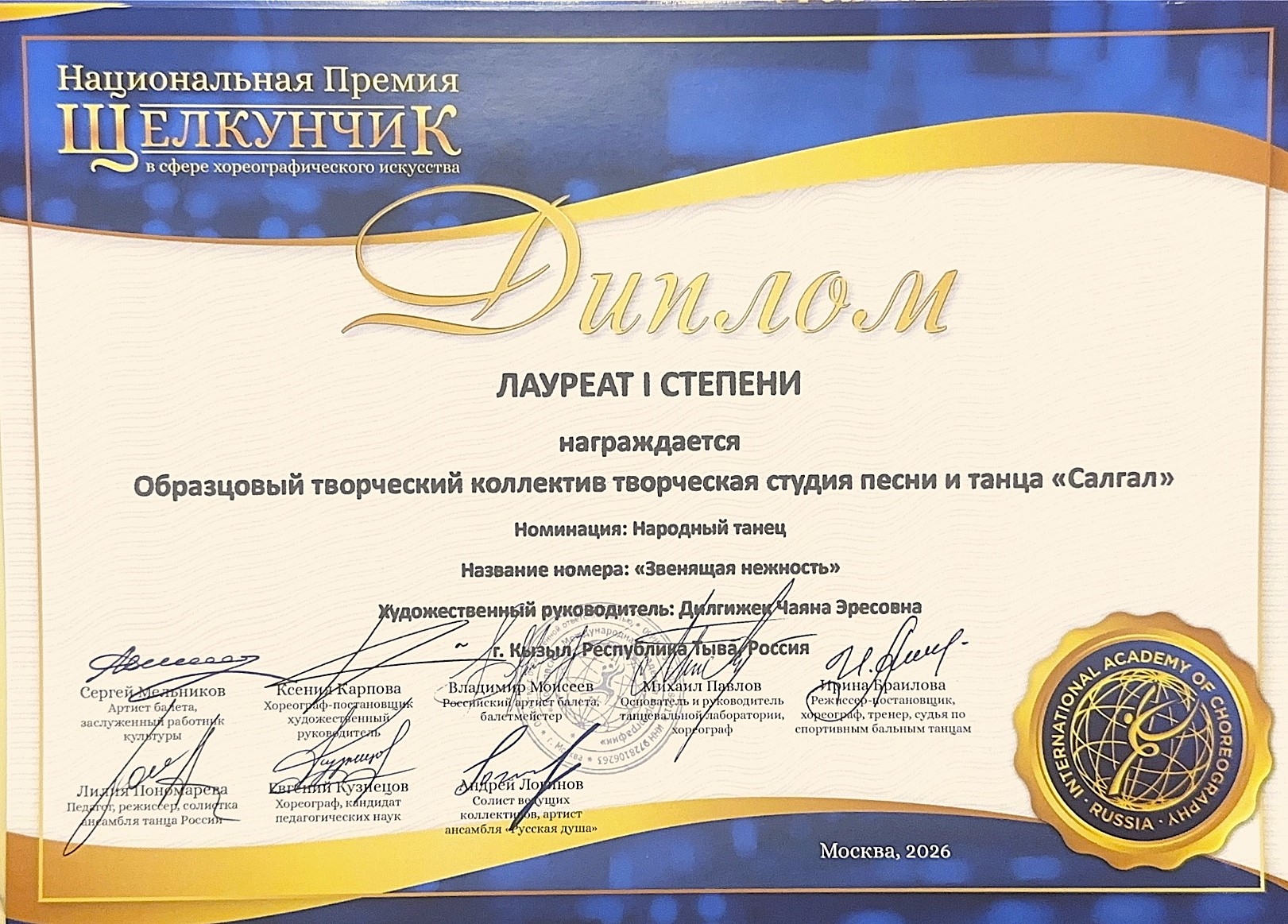 Январь 10-дан 13-ке чедир Москвага ат-сураглыг Национал «Щелкунчик» шаңналының мөөрейи болуп эрткен. Бүгү Россияның 200 ажыг бөлүктериниң эң-не тергиин ат дээш демиселинге ыры болгаш танцы-самның “Салгал” студиязы бирги черни чаалап алган.