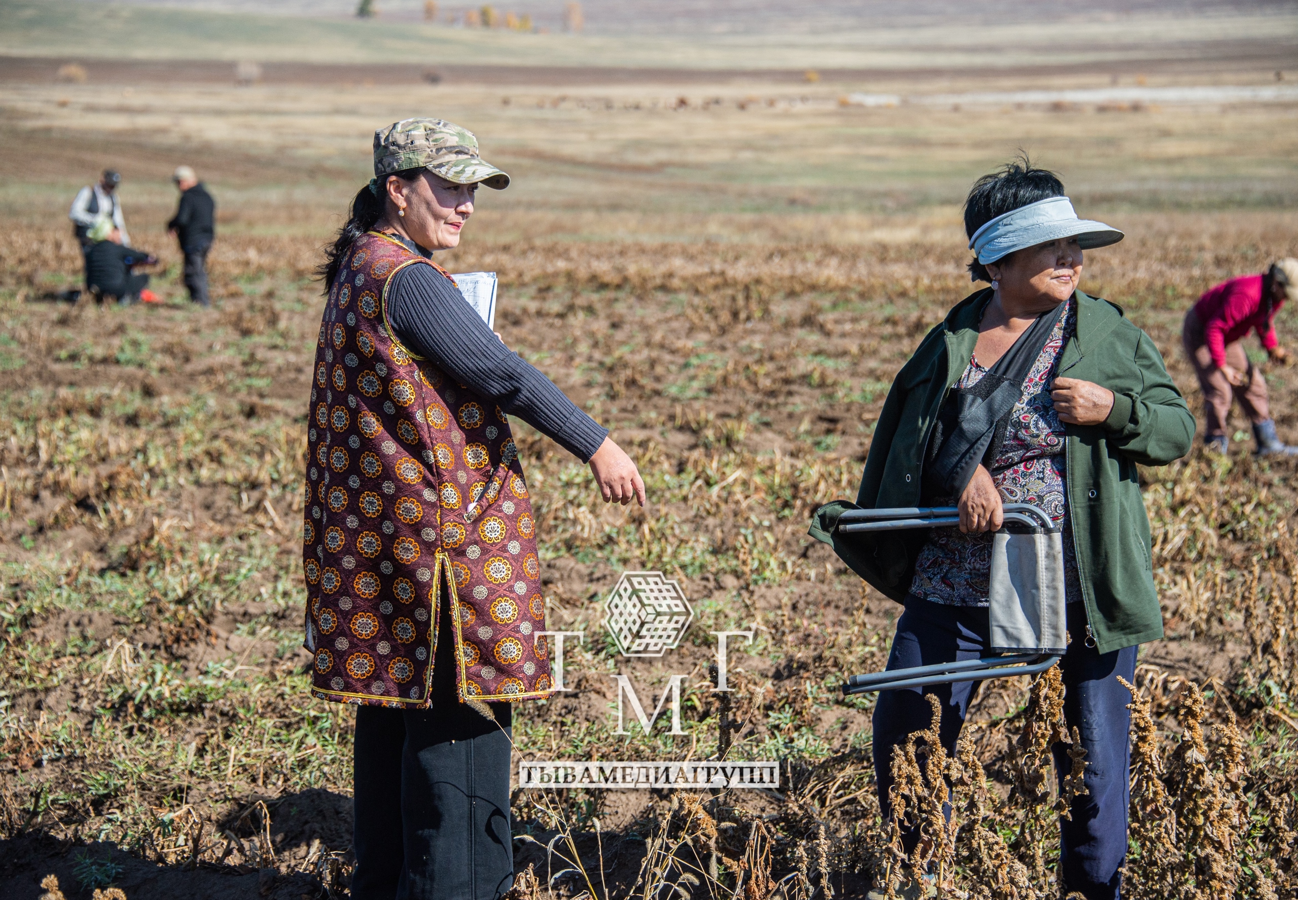 “Идегелдиң шөлү” көдээ ажыл-агый бүдүрүлге кооперативиниң даргазы Алёна Куулар ажыл-агыйын таныштырды: «Бо чылын бистиң кооператив 60 хире гектар шөлге картофельди олурткан. Ооң иштинде 7 гектар черде «Өг-бүле шыгжамыры» төлевилелдиң киржикчилериниң картофелин тараан. Бөгүн олар бис-биле демнежип тургаш тараан картофелиниң дүжүдүн ажаап ап турары бо. Бис оларның картофелин чемишчидип, канчаан ажаап өстүрерин айтып берип дузалажып турдувус. Мындыг берге кааңдаашкынныг үеде эки дүжүттү өстүрүп шыдаптылар. Бистиң кооператив-биле демнежип ажылдаанывыс түңнелинде бо шөлдерде картофельдиң эки үнгенин көрүп тур силер.