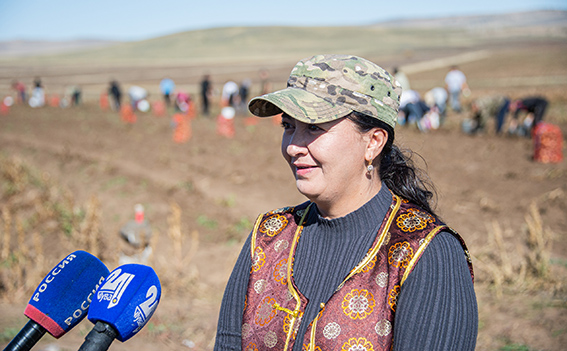 “Идегелдиң шөлү” көдээ ажыл-агый бүдүрүлге кооперативиниң даргазы Алёна Куулар ажыл-агыйын таныштырды: «Бо чылын бистиң кооператив 60 хире гектар шөлге картофельди олурткан. Ооң иштинде 7 гектар черде «Өг-бүле шыгжамыры» төлевилелдиң киржикчилери картофелин тараан. Бөгүн олар бис-биле демнежип тургаш тараан картофелиниң дүжүдүн ажаап ап турары бо. Бис оларның картофелин чемишчидип, канчаан ажаап өстүрерин айтып берип дузалажып турдувус. Мындыг берге кааңдаашкынныг үеде эки дүжүттү өстүрүп шыдаптылар. Бистиң кооператив-биле демнежип ажылдаанывыс түңнелинде бо шөлдерде картофель үнүп келгени бо.