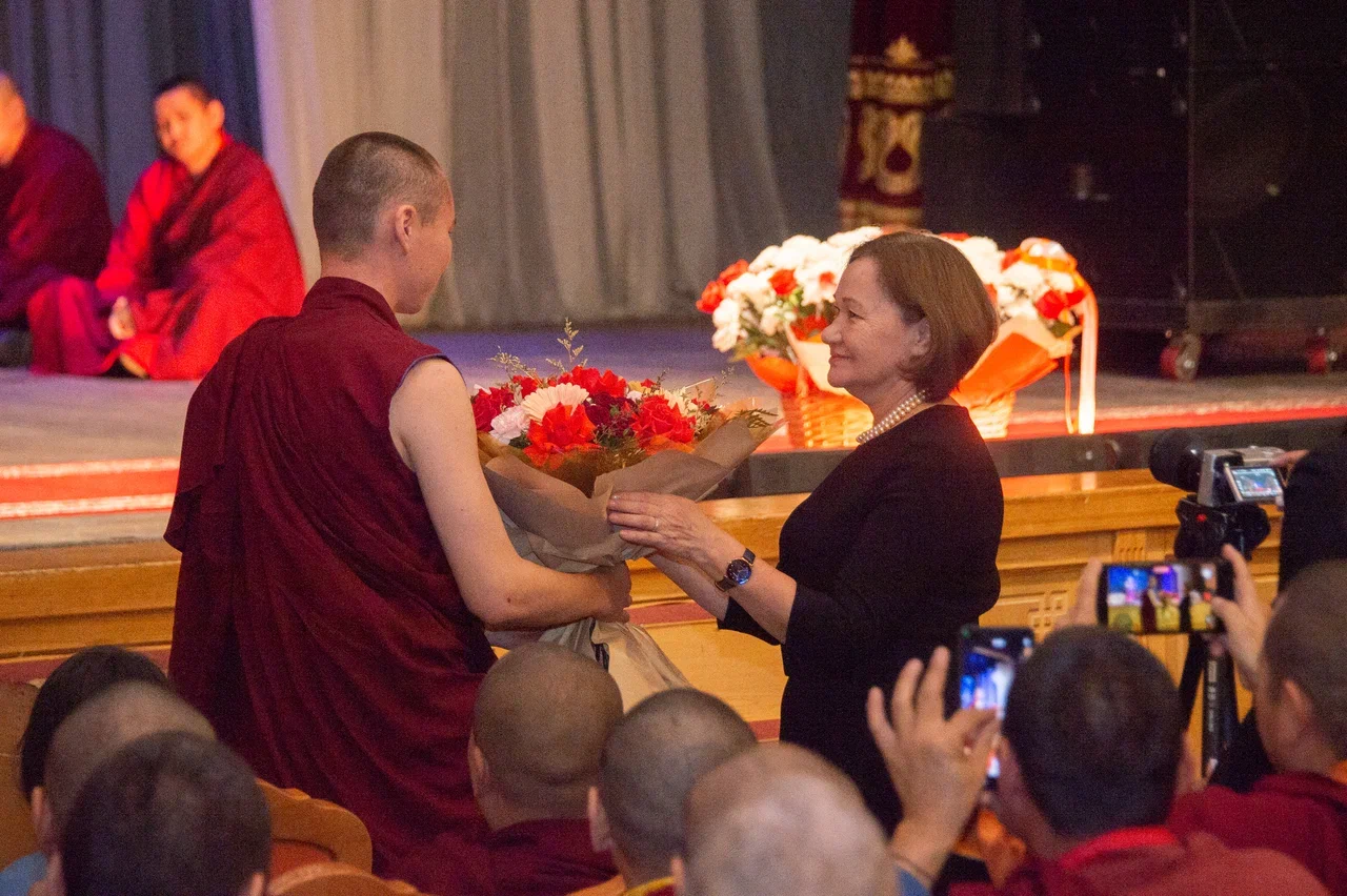 Тываның Баштыңы Владислав Ховалыг байыр чедирип тура, Тывага сарыг шажын шагдан тура сайзыралды алганын илеткээн. 1700 чылдарда бир дугаар хүрээлер туттунганын, 1928 чылда Севээн Кешпи Башкының тыва лама башкылар съездизинге ниитилелдиң сайзыралы-биле катай шажын-чүдүлге база сайзыраар ужурлуг деп айытканын демдеглээн. Акы-дуңма, чаңгыс чүдүлгелиг республикалар: Тыва, Калмыкия, Бурятия – сарыг шажынның сайзыралы дээш улуг харыысалганы хүлээнип алганын база айыткан. Тывага улуг хүрээниң болгаш Россияның буддийжи университединиң ажыдыышкынынга улуг деткимчени көргүскени дээш Күжүгет Шойгу аттыг культурлуг фондуга өөрүп четтиргенин илереткен.