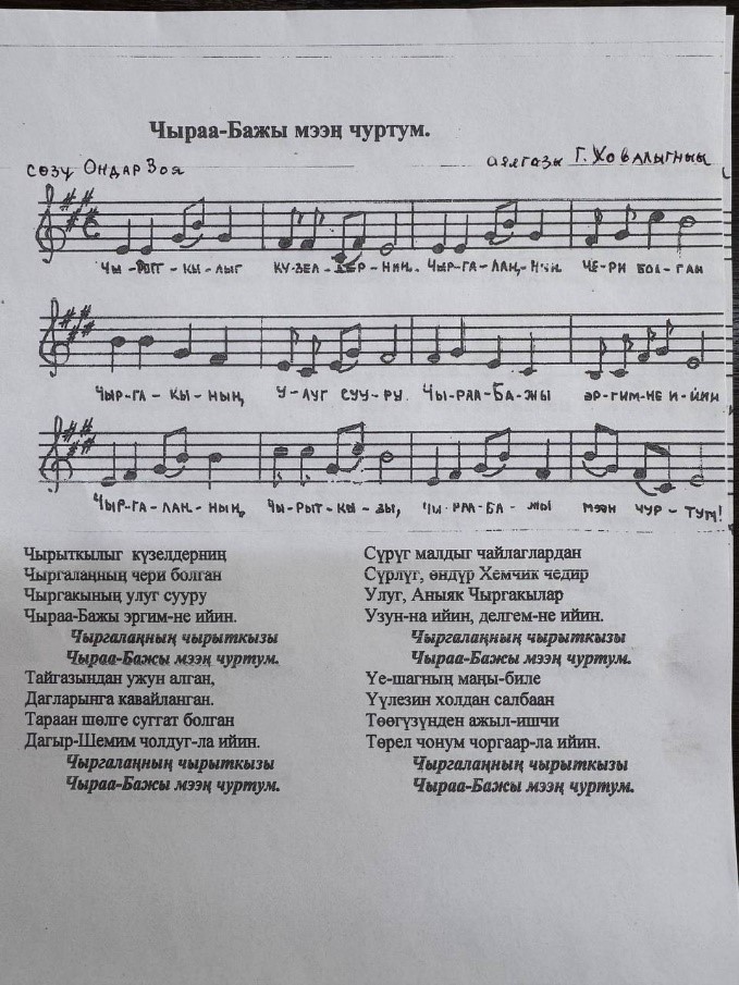 Шүлүктериниң аразындан төрүттүнген сууру Чыраа-Бажынга тураскааткан шүлүү ыры болуп хуула берген. Аялгазын Тыва Республиканың Композиторлар эвилелиниң кежигүнү Галина Давааевна Ховалыг бижээни база өөрүнчүг.
