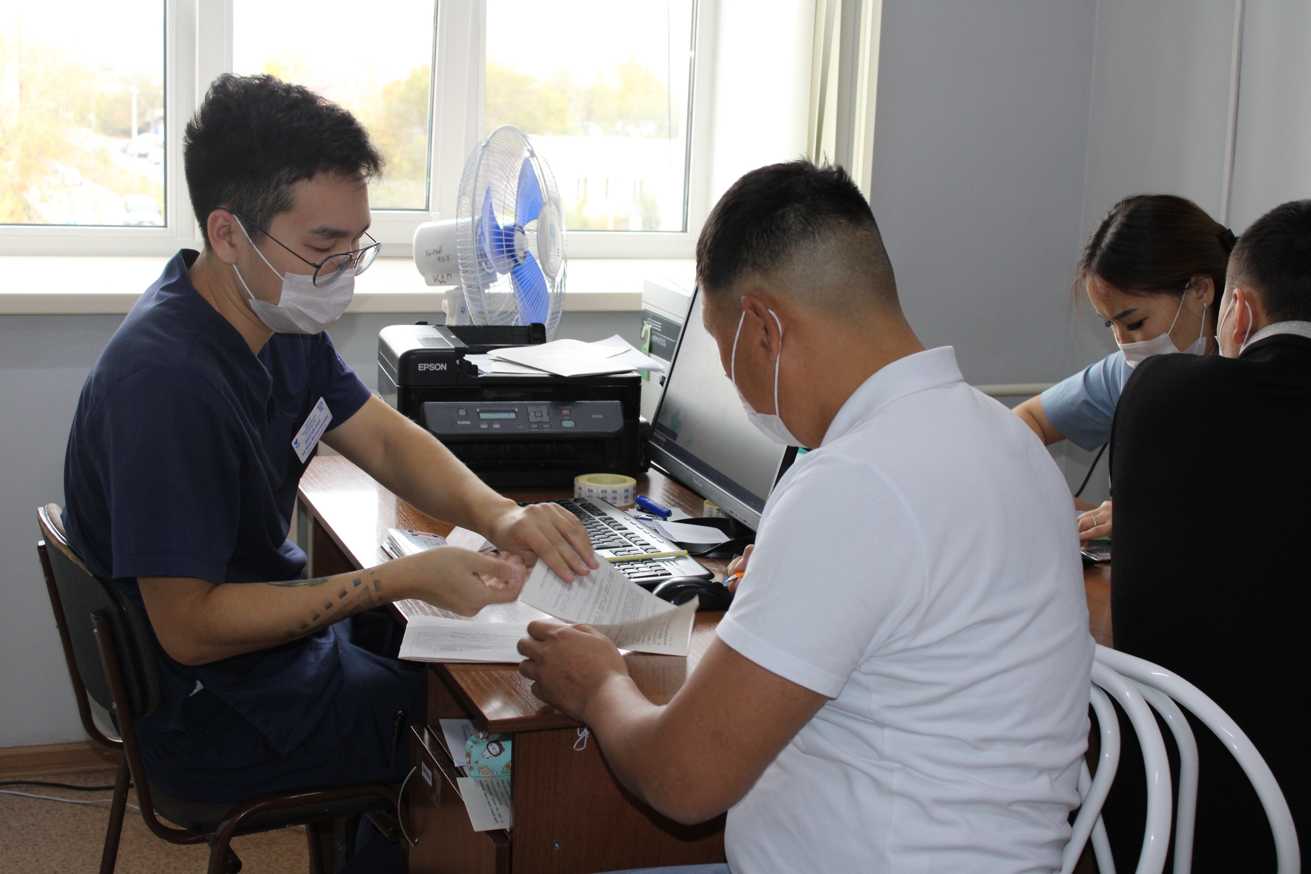 Эгезинде улус бүрүткээр черде ТШО киржикчилеринге көрдүнген соңгажыгашка азы бүрүткел чериниң ниити чон хүлээр черинге оочур чокка чеде бээр. Ооң соонда 408 дугаар кабинетче оочурдан дашкаар кире бээр. Бир эвес ТШО киржикчизиниң кылаштаары багай болза, бирги каътта 103 дугаар кабинетке баар. Аңаа баргаш, болгу дег аарыгларны тодарадыр анкетаны долдурар, узунун, деңзизин, долгандырыын хемчээр, ниити хан анализин дужаар, ЭКГ-ни эртер. Ооң соонда флюорографияны эрткеш, терапевт эмчиниң консультациязын алыр.