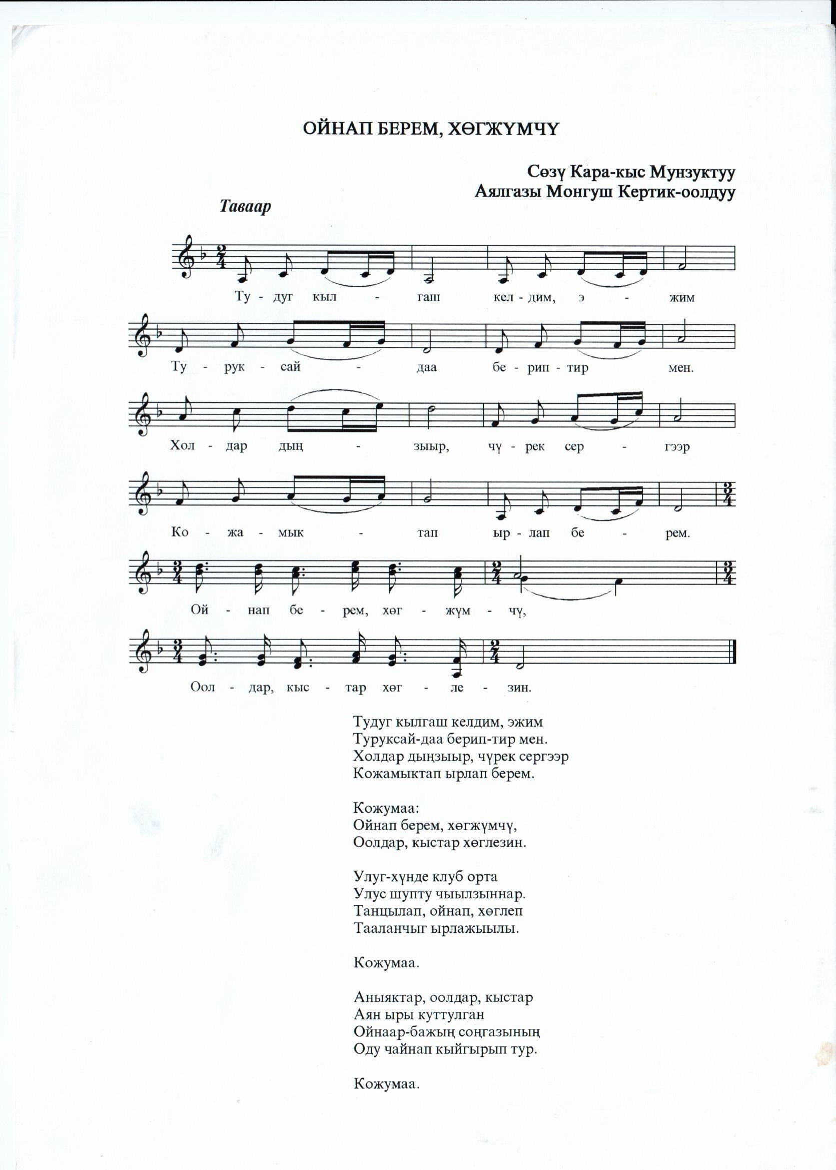 Баштай ырының вариациялыг ноталарын сайгарып кѳрүп олурумда, К. Күжүгетович чанымга чеде хонуп келди. Ырыны кѳргеш: «Аа ол-дур, Шура, школага ырлажып, танцылап шаг болдувус чоп, эки ойнап турдуң» деп сымыранып чугаалааш, сандайынга барып олуруп алды.